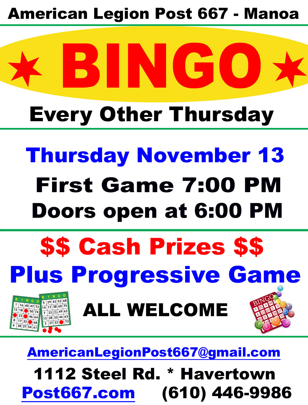 At Post 667, we offer veterans support services, community programs, banquet hall rentals, live music & events. Cash bingo.Β We have opportunities to join our American Legion, Auxiliary, or Sons of the American Legion.