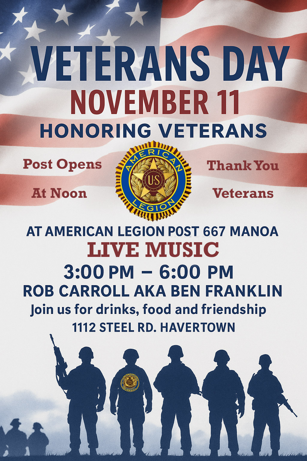 Welcome to American Legion Post 667 β Manoa (Havertown, PA) Serving veterans, their families, and our local community in Delaware County since 1935.
